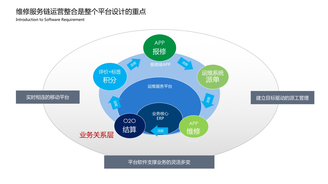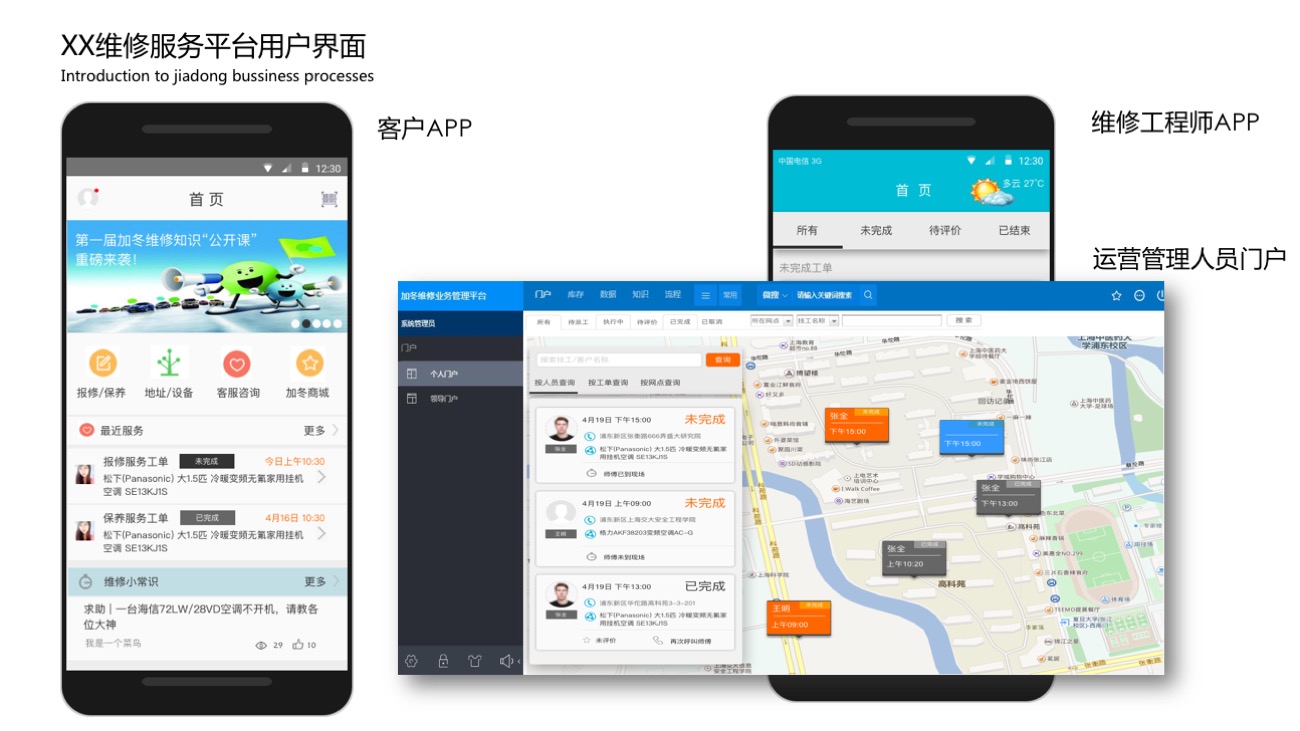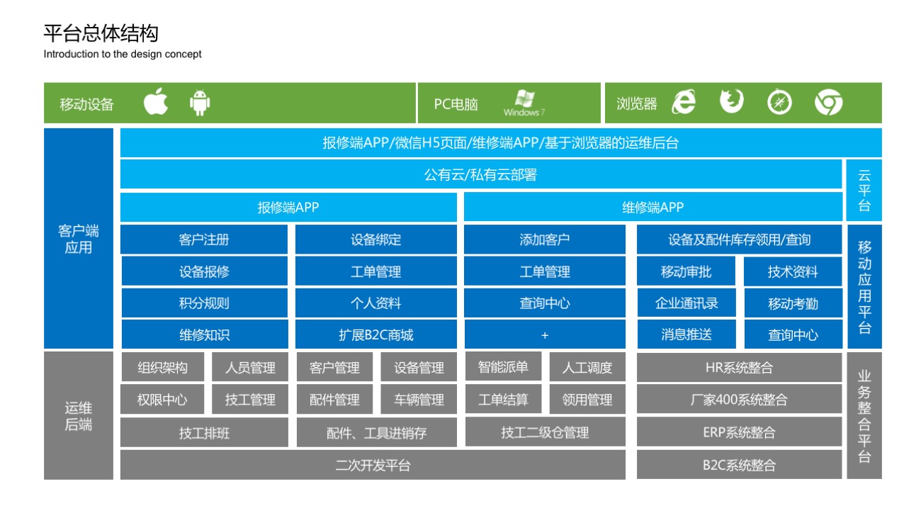 平台包含客户端APP(苹果版+安卓版)、维保端APP(安卓版)和运营平台三大部分。