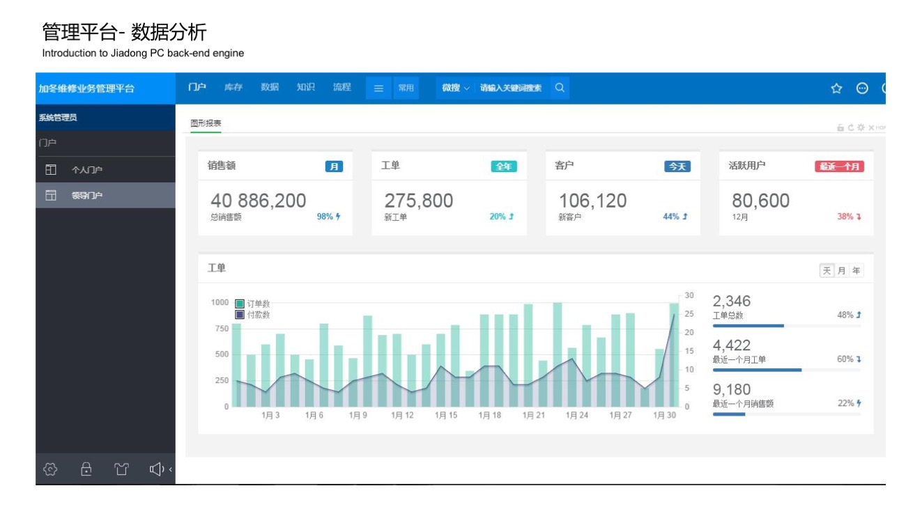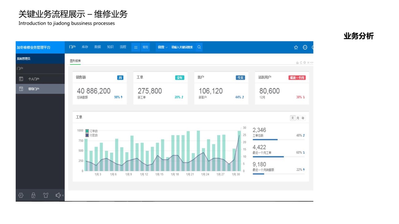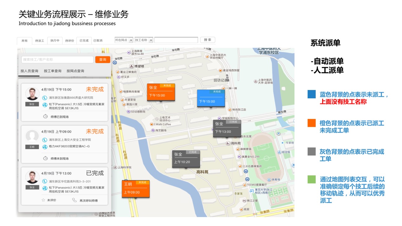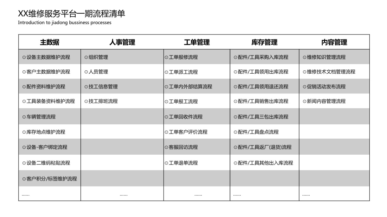 - 售后服务平台是综合管理平台,切分成多个管理与操作功能,根据不同岗位、角色、安全级别和业务需求进行权限管理。功能包含:客户管理;设备管理(客户、设备与工单三方关联);技工管理;工单管理;物料管理;知识管理;费用管理(工时、物料、工具定价,损耗额度规则);系统管理等等