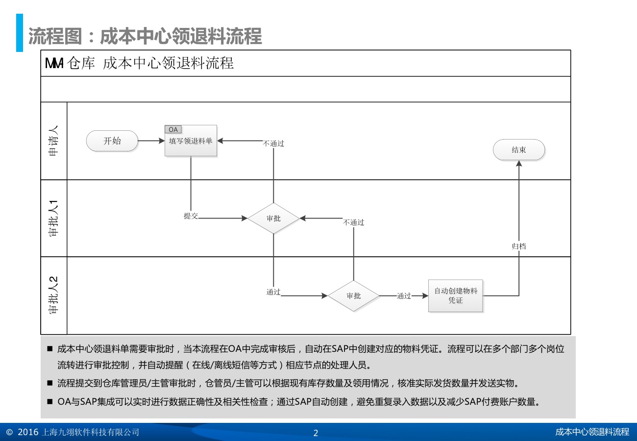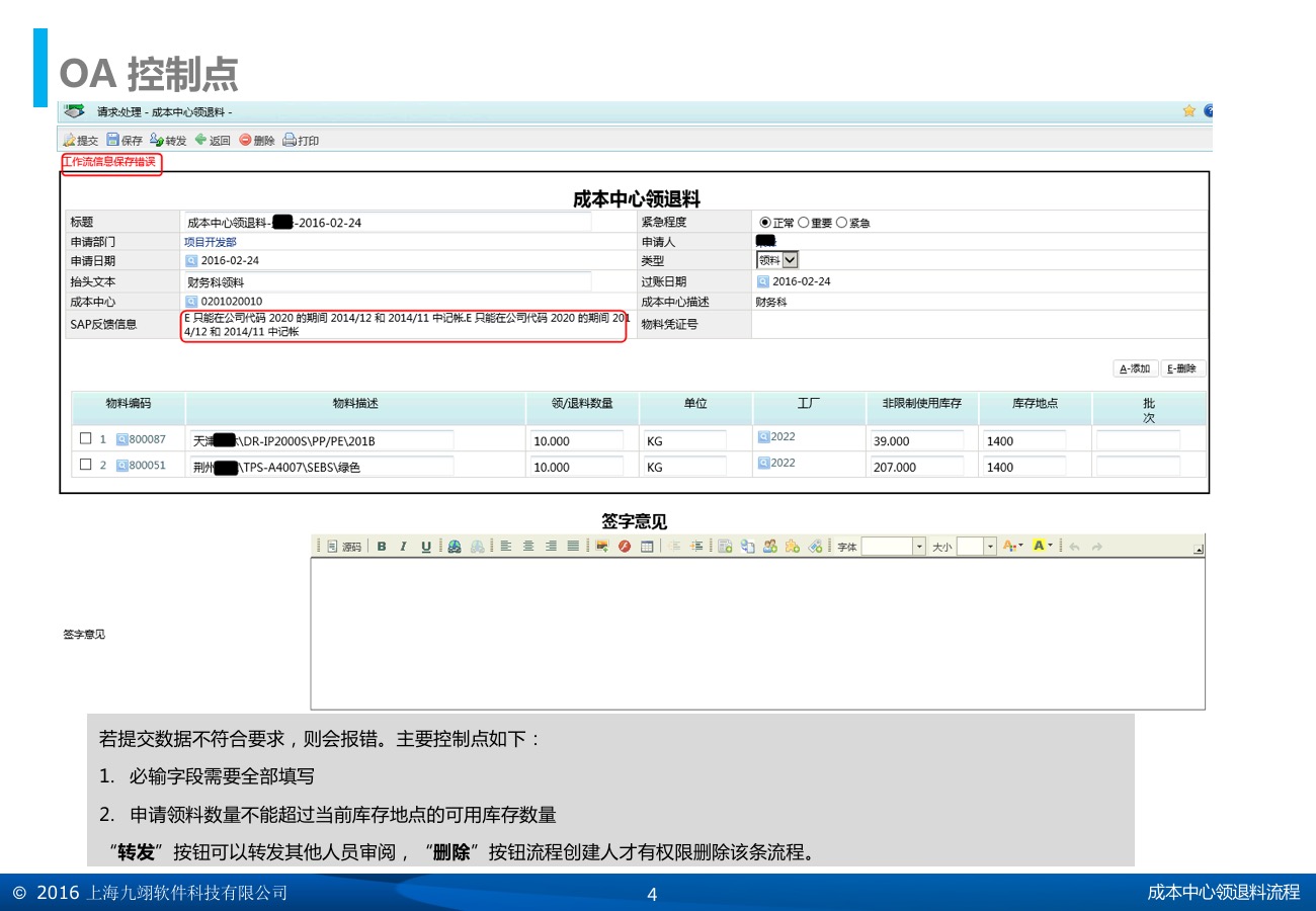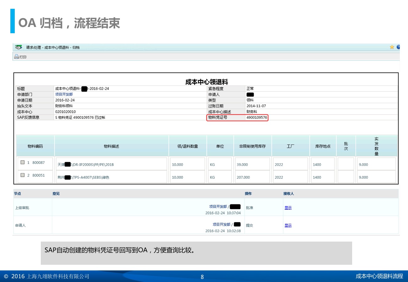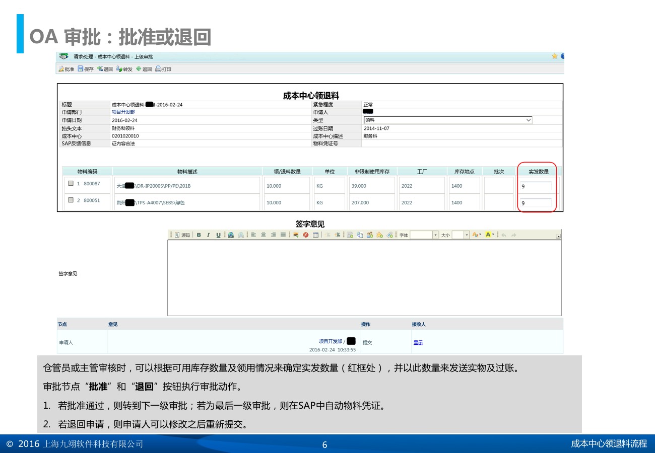 - 成本中心领退料单需要审批时,当本流程在OA中完成审核后,自动在SAP中创建对应的物料凭证。流程可以在多个部门多个岗位流转进行审批控制,并自动提醒(在线/离线短信等方式)相应节点的处理人员。 流程提交到仓库管理员/主管审批时,仓管员/主管可以根据现有库存数量及领用情况,核准实际发货数量并发送实物。