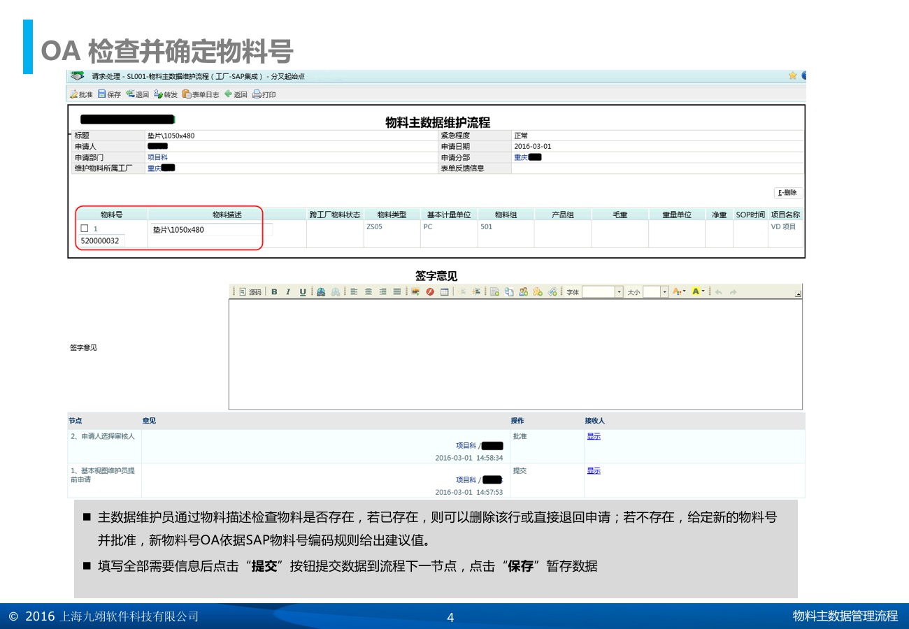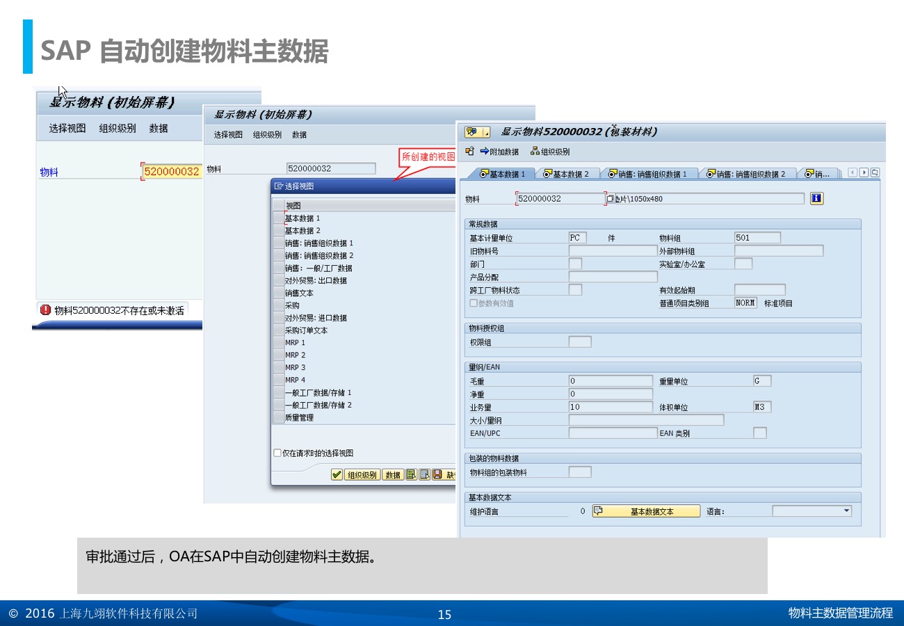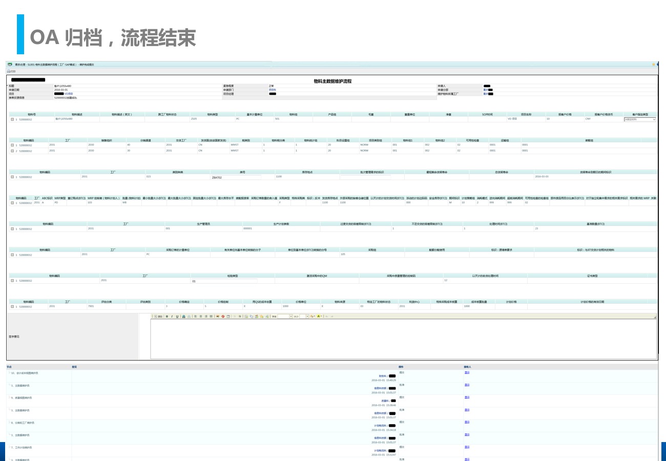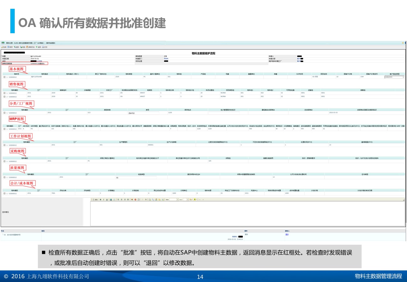 申请人有物料主数据新增的需求时,先在OA中检查是否已存在,若不存在则正确填写物料基本数据并提交。主数据维护员根据物料描述确定物料不存在,并确定新物料号。之后各视图维护员分别维护销售、采购、MRP、工作计划、财务、质检、分类(特性)等数据。视图都维护完后,重新流转到主数据维护员,由其确定并提交到SAP,自动在SAP创建物料主数据。物料创建成功后,可流转到后续提醒节点,提醒相关人员创建对应BOM、工艺路线等数据