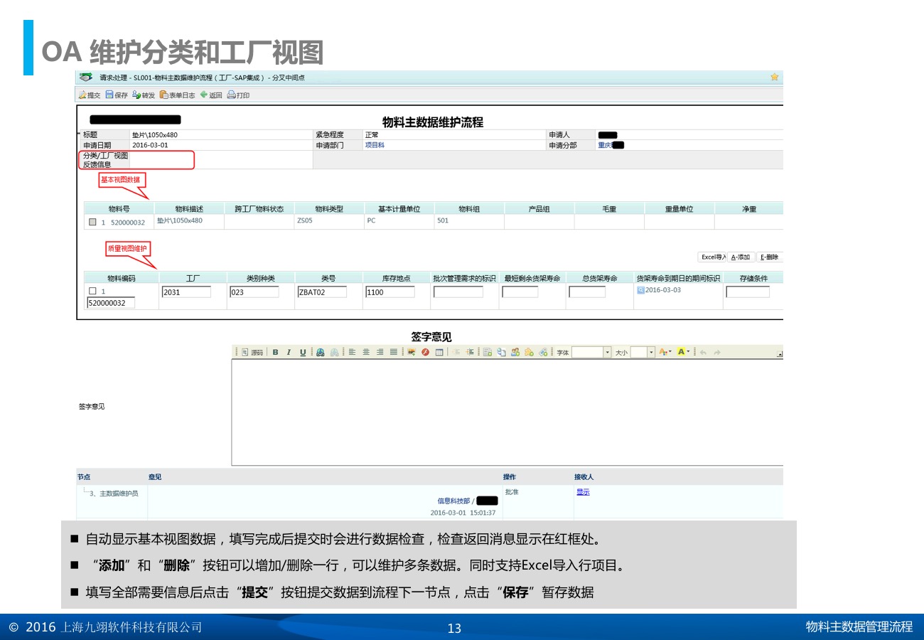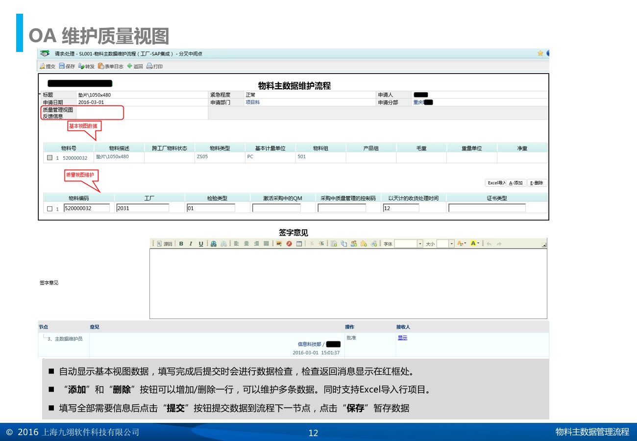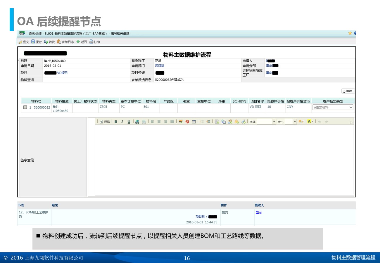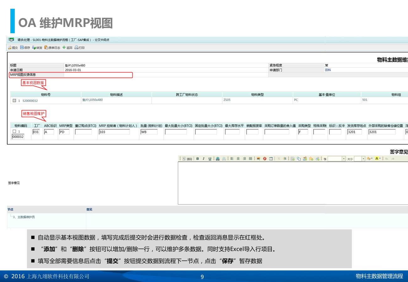 申请人有物料主数据新增的需求时,先在OA中检查是否已存在,若不存在则正确填写物料基本数据并提交。主数据维护员根据物料描述确定物料不存在,并确定新物料号。之后各视图维护员分别维护销售、采购、MRP、工作计划、财务、质检、分类(特性)等数据。视图都维护完后,重新流转到主数据维护员,由其确定并提交到SAP,自动在SAP创建物料主数据。物料创建成功后,可流转到后续提醒节点,提醒相关人员创建对应BOM、工艺路线等数据