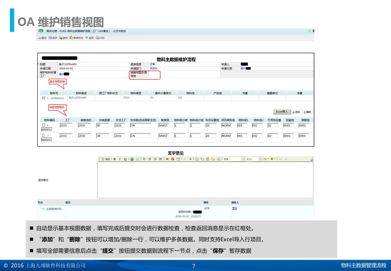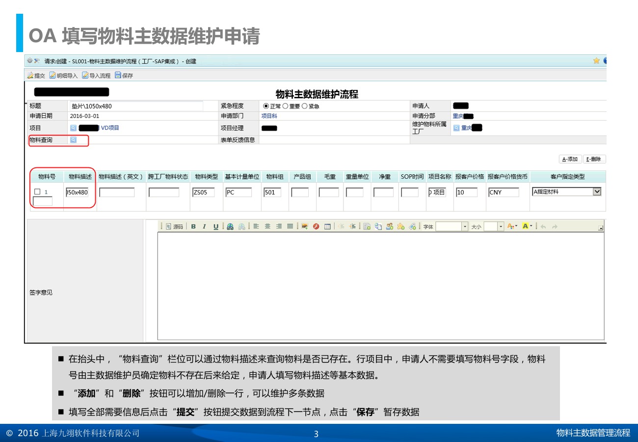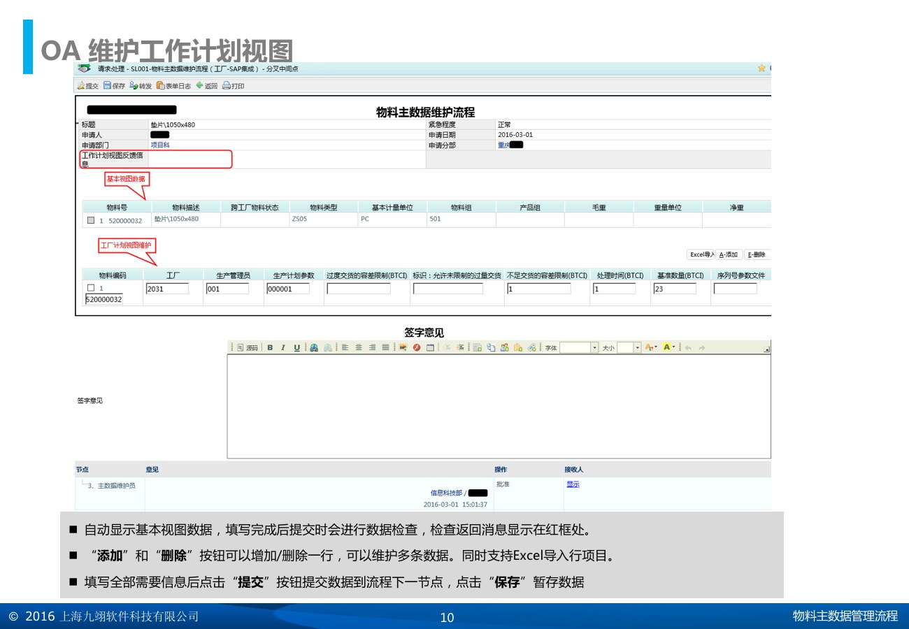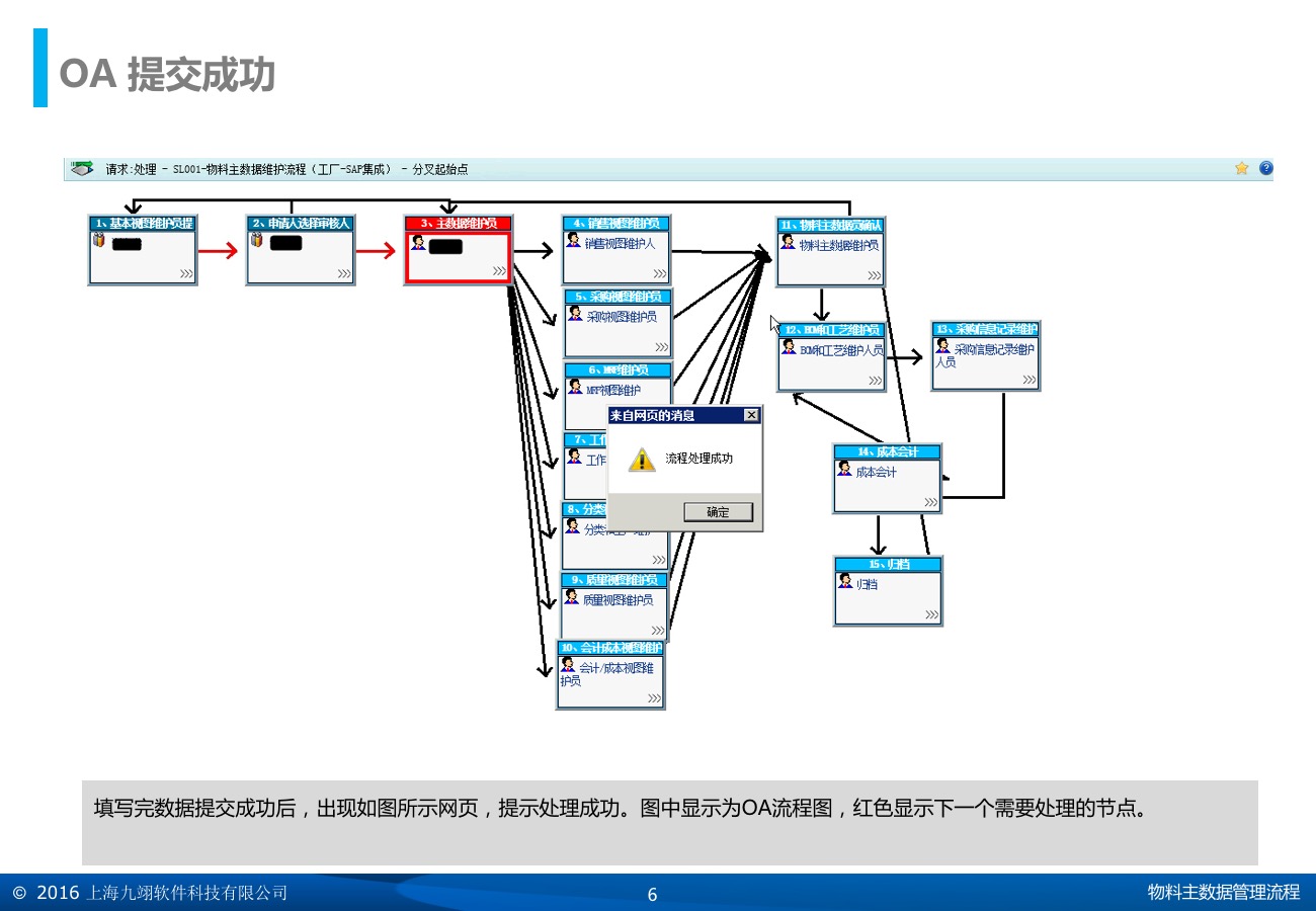 申请人有物料主数据新增的需求时,先在OA中检查是否已存在,若不存在则正确填写物料基本数据并提交。主数据维护员根据物料描述确定物料不存在,并确定新物料号。之后各视图维护员分别维护销售、采购、MRP、工作计划、财务、质检、分类(特性)等数据。视图都维护完后,重新流转到主数据维护员,由其确定并提交到SAP,自动在SAP创建物料主数据。物料创建成功后,可流转到后续提醒节点,提醒相关人员创建对应BOM、工艺路线等数据