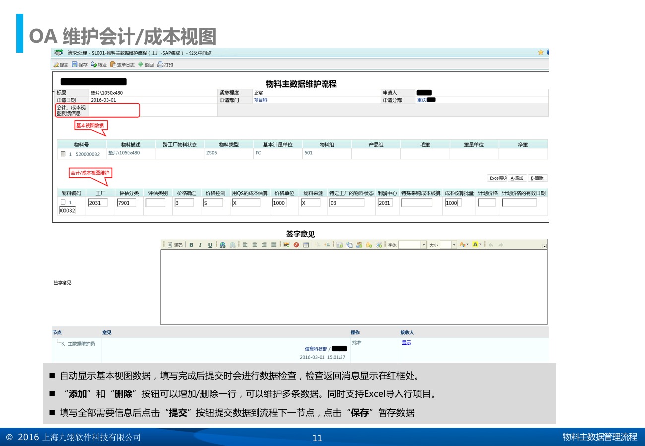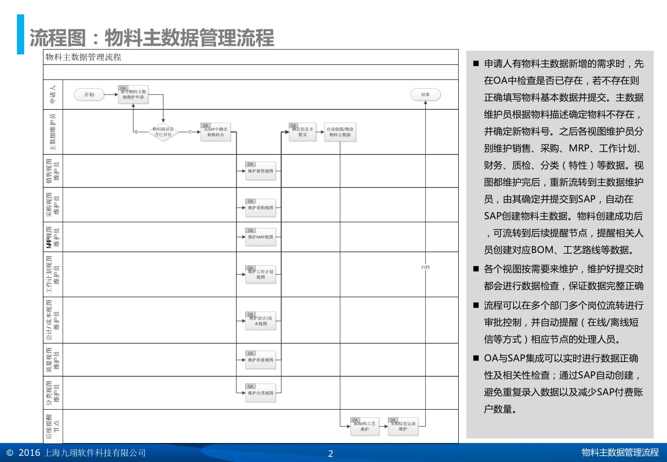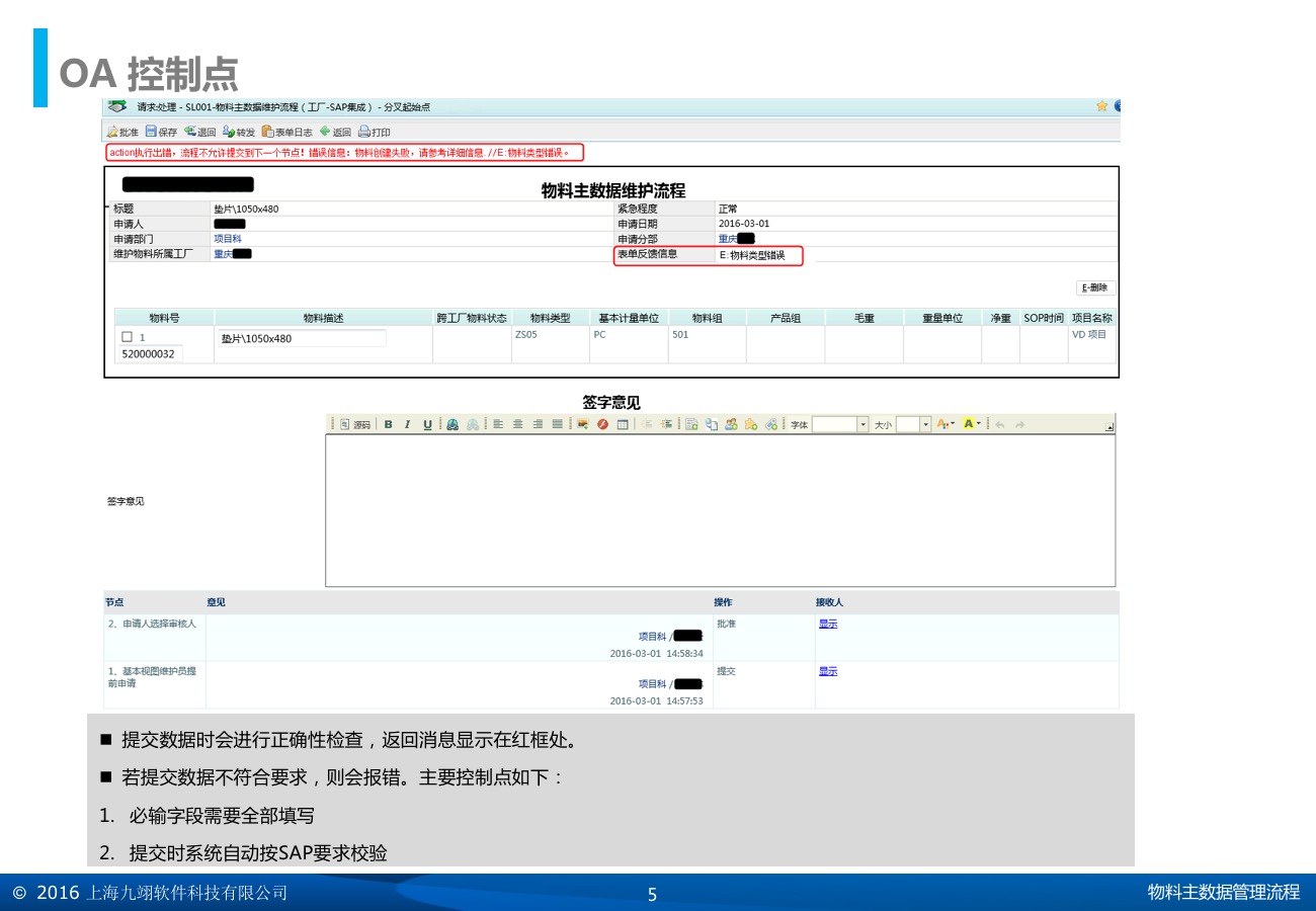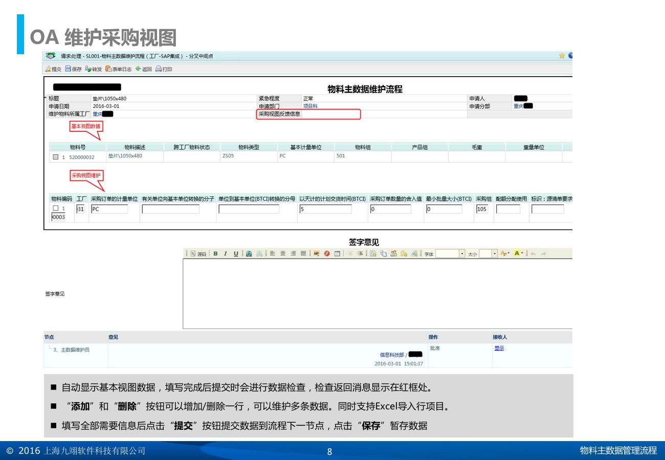 申请人有物料主数据新增的需求时,先在OA中检查是否已存在,若不存在则正确填写物料基本数据并提交。主数据维护员根据物料描述确定物料不存在,并确定新物料号。之后各视图维护员分别维护销售、采购、MRP、工作计划、财务、质检、分类(特性)等数据。视图都维护完后,重新流转到主数据维护员,由其确定并提交到SAP,自动在SAP创建物料主数据。物料创建成功后,可流转到后续提醒节点,提醒相关人员创建对应BOM、工艺路线等数据